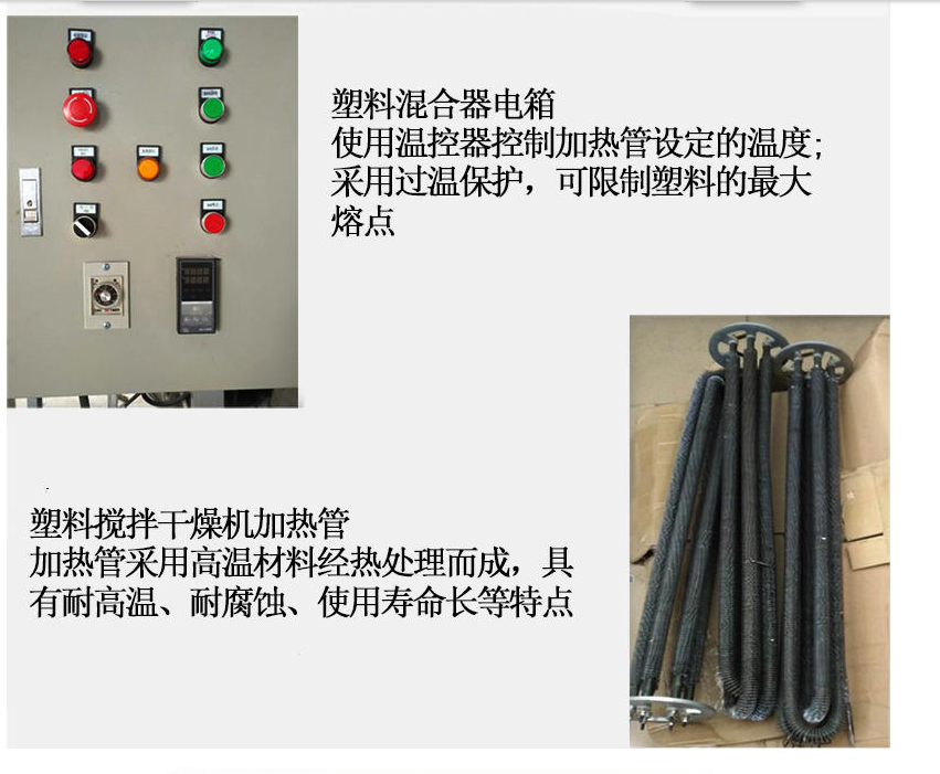 8、干燥混合功能二合一,但不需要干燥時,只需將“加熱開關”及“風機開關”關閉,本系列機型即可用于塑料攪拌均化用途,一機二用;